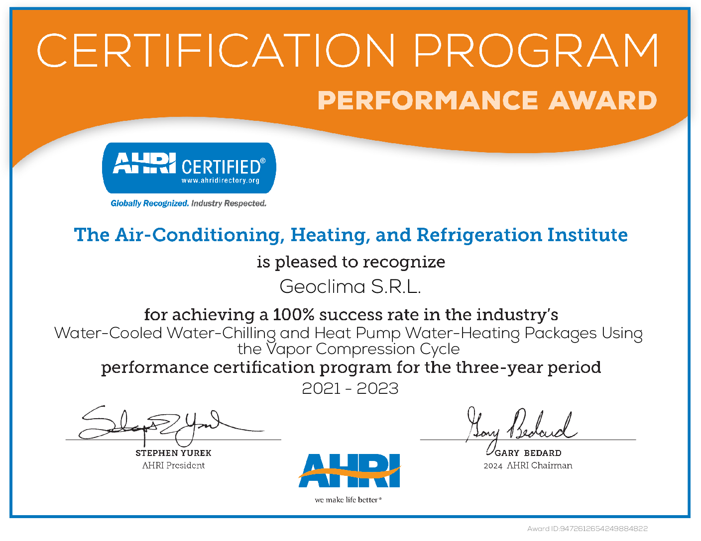 Geoclima has achieved a remarkable milestone by obtaining a 100% success rate in the AHRI Performance Certification Program for the years 2021 to 2023. This outstanding award underscores Geoclima’s unwavering commitment to delivering top-level chillers to the market.