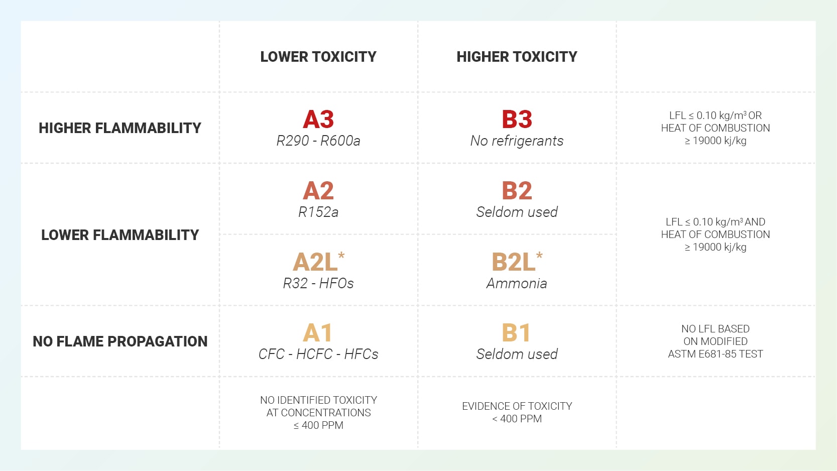 *A2L and B2L are lower flammability refrigerants with a maximum burning velocity <10 cm/s