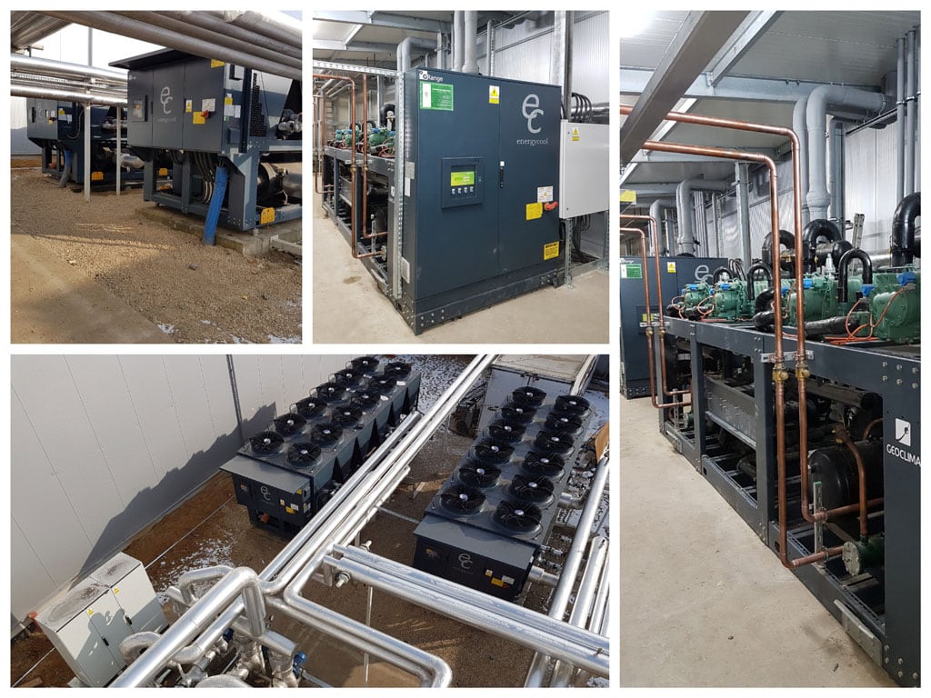 Specifically, we provided two screw compressors air cooled units for 650 kW of total cooling capacity and two 200 kW low temperature compression units, each one of these connected to two remote oil coolers and to one remote condenser installed on the roof.
