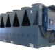 Chiller condensato ad aria con compressori a vite, ventilatori assiali e sistema adiabatico per installazione esterna