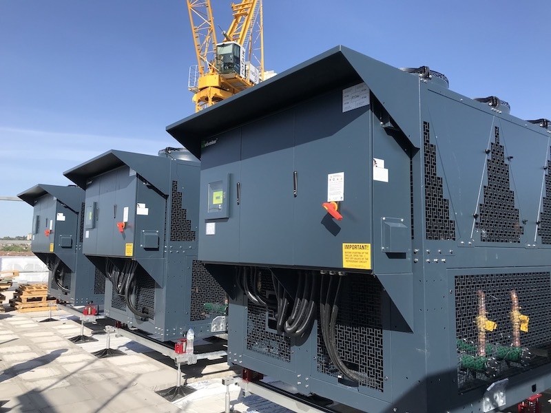 Our designers, together with our distributor Cooltherm, developed 5 Turbomiser air cooled chillers, with oil-free centrifugal compressors, for both buildings: