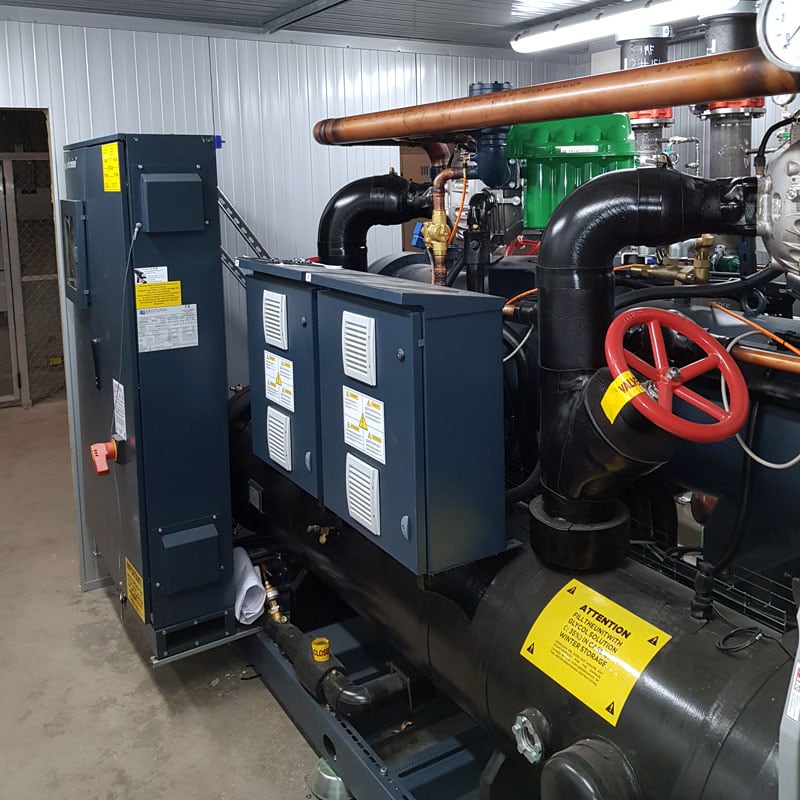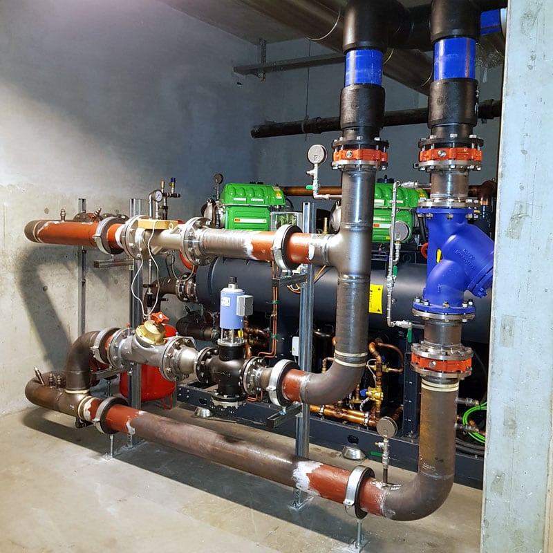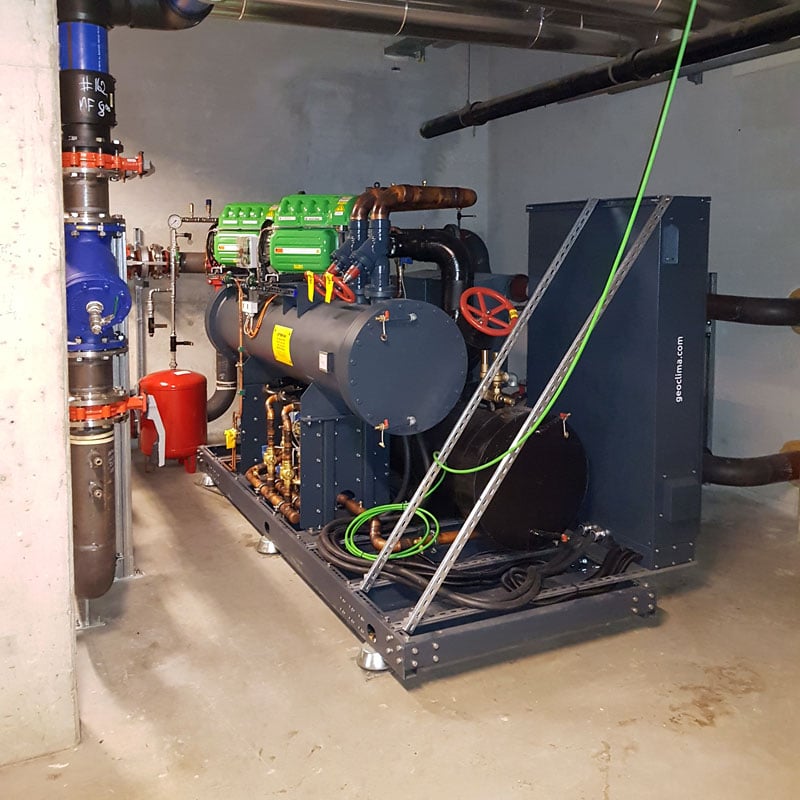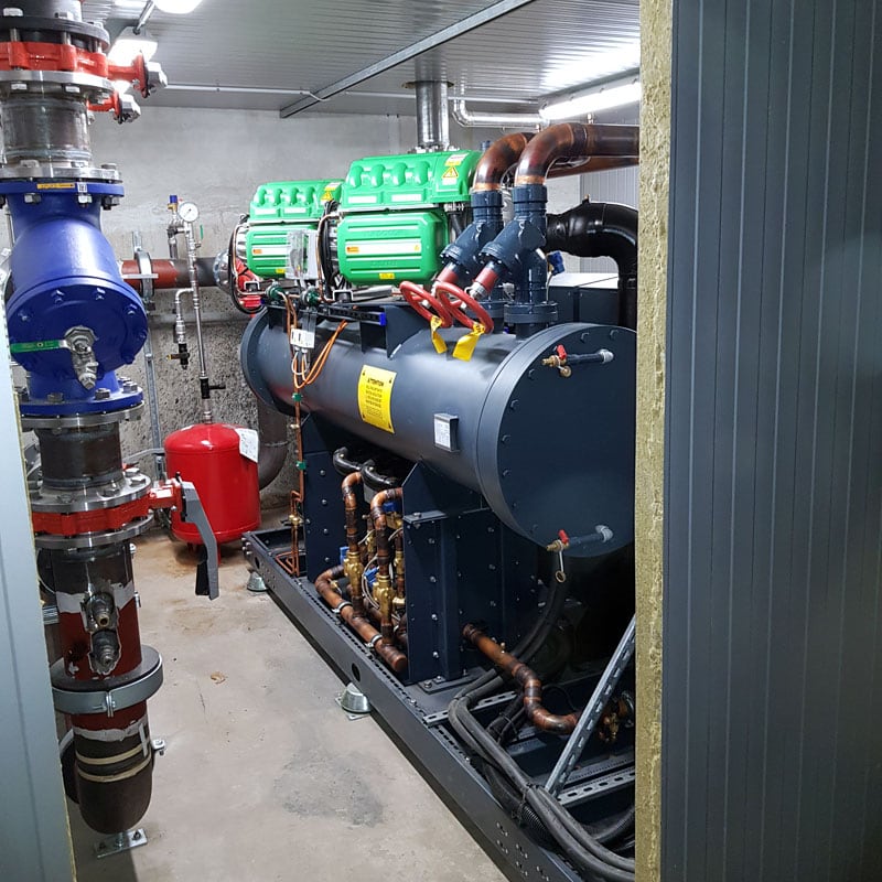 Geoclima designed three 700 kW Turbomiser water cooled chillers with oil-free centrifugal compressors and heat recovery function. The chillers are installed in separate machine rooms for fire and noise suppression with their own safety systems.