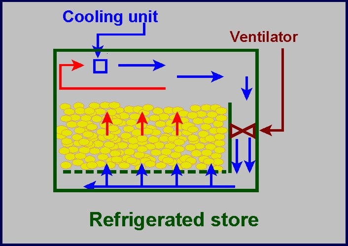The objective was the development of a highly efficient warehouse, taking into account the several problems concerning the storage and the conservation of potatoes. The first issue was about the high consumption of energy necessary for the operation of the plant. Another important issue concerned the necessity to remain within a very narrow temperature range, relating to the specific potatoes storage conditions. Moreover, the different uses of potatoes require different temperatures (from 4 °C to 10 °C) and this results in the necessity of a dual set point. Finally, there was the need to develop a plant able to control sudden changes of temperature caused by different conditions, such as: external climate variations; interventions within the warehouse (opening/closing of doors, etc.); the tendency of tubers to vegetate or ferment. There was also the need to consider that we were dealing with perishable and edible products and, therefore, it was required to keep within strict conservation rules.