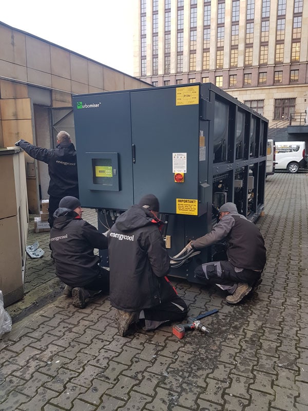 The new Turbomiser unit has to be installed indoor, in the technical room underground, with a very difficult access, where it is not possible to enter and move the whole unit. To face this problem the new chiller was designed and produced to be completely dismantled outside the library, carried in parts through narrow corridors and then fit back together and installed within the technical room.