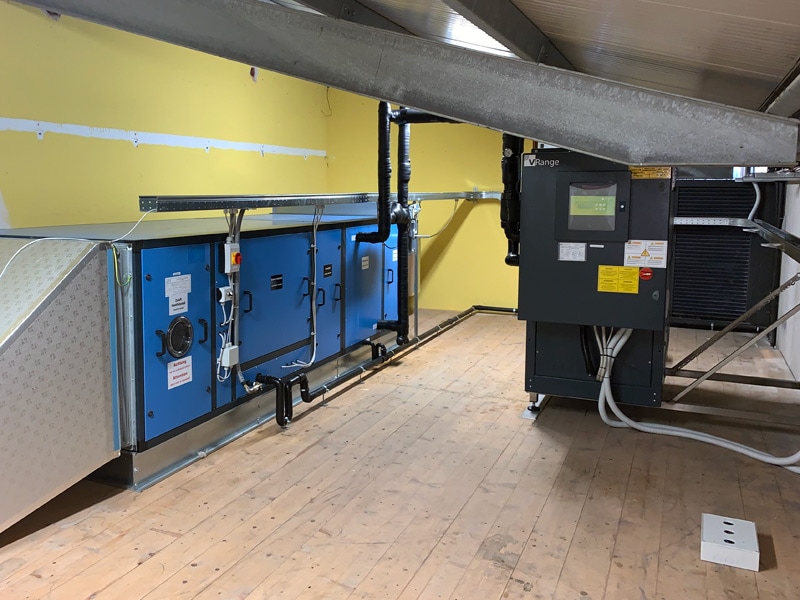 To keep constant temperatures and humidity throughout the year in the new barrel room, currently composed of 160 barrels, we provided a 7000 m3/h Climatech air handling unit, powered by a split refrigeration unit, consisting of a Geoclima condenserless VSE and a 40 kW (11 RT) Althermo modular remote condenser.