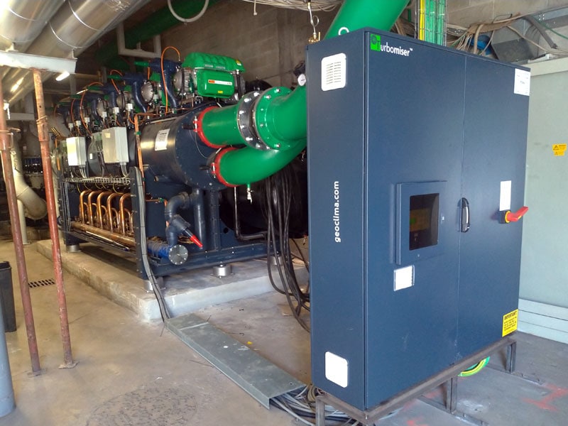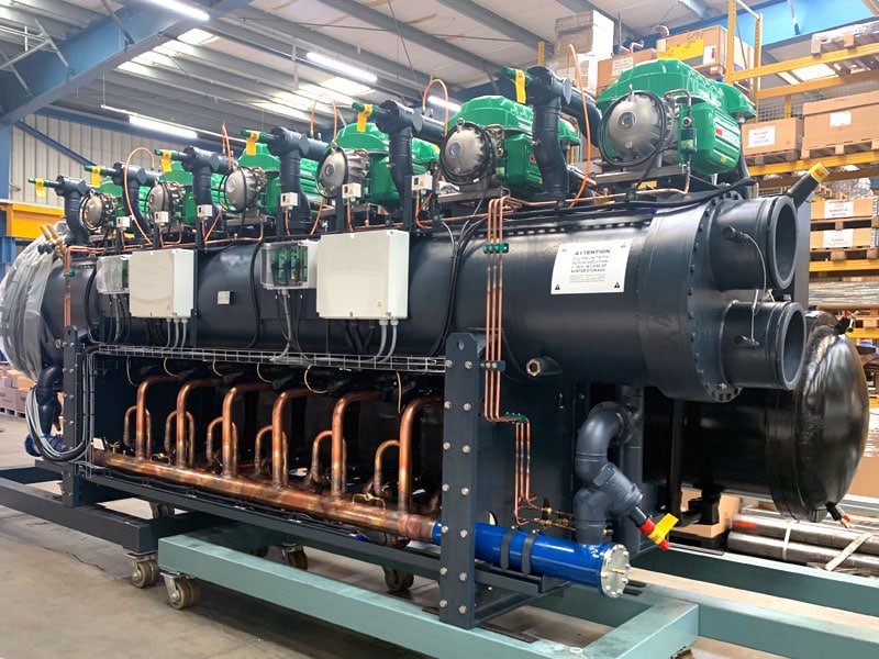 To meet these needs, we have designed a 3000 kW (853 RT) water-cooled chiller, with 6 oil-free centrifugal compressors. All this in a length of only 6100 mm (20 ft). The chiller ensures high levels of energy efficiency (EER 6.76 W/W*) and uses HFO-1234ze, the most environmentally friendly refrigerant gas on the market (GWP<1).