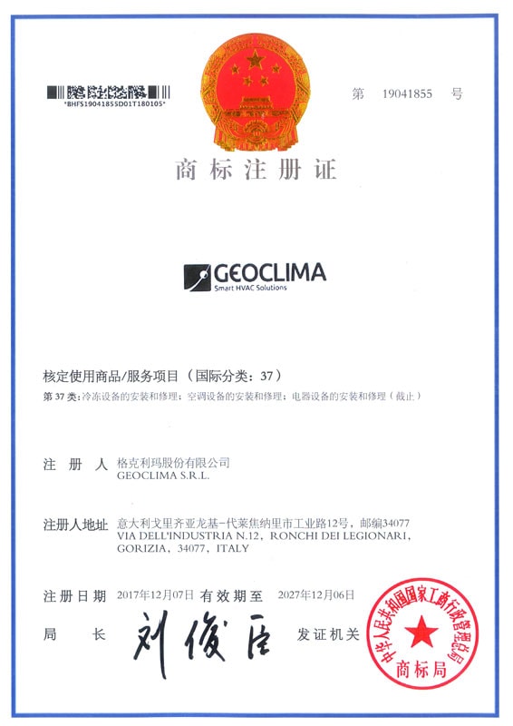 Geoclima has been recently registered as a trademark in China. This is going to be a further assurance for our clients and partners with a view to Geoclima’s presence and expansion in the Asian market.