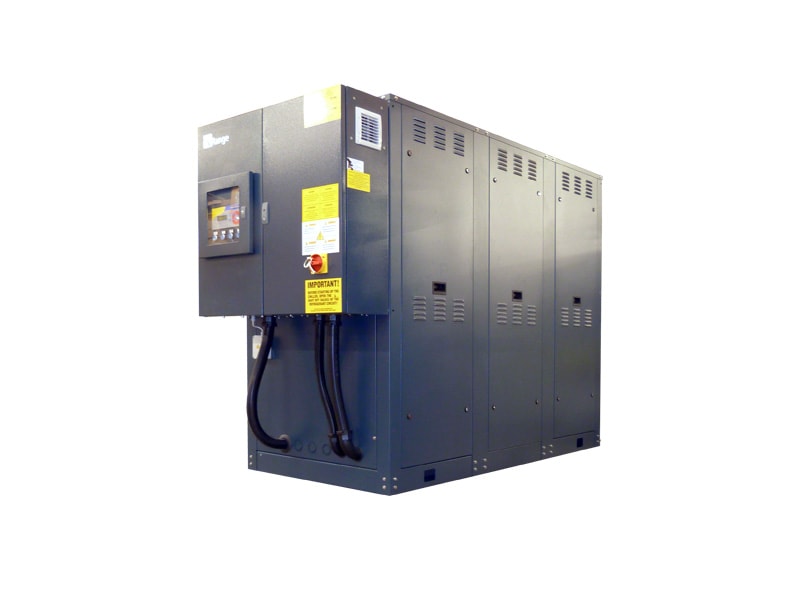 The V-Range includes all chillers with scroll and reciprocating compressors, whose main feature is the guarantee of reliability and durability, with consequent advantages in terms of cut in management and maintenance costs. These chiller are characterized by compact size and light weight, and, therefore, turn out to be particularly suitable for small plants. In addition to that, the few vibrations and the very low noise levels ensure that these chillers are used in industrial but also in civilian applications (comfort cooling). The great innovation introduced by Geoclima, especially as far as scroll compressors with R410A are concerned – but some applications have been studied also for reciprocating compressors with R290 – consists in the possibility to combine several compressors in a single unit. Indeed, if this kind of chiller usually has a very reduced capacity (from 3 to 50 kW), the redundancy enables the development of machine with higher capacity, even of hundreds kW. In thereby, the V-Range units are no more restricted to small-size applications but, on the contrary, can also be used for bigger plants.